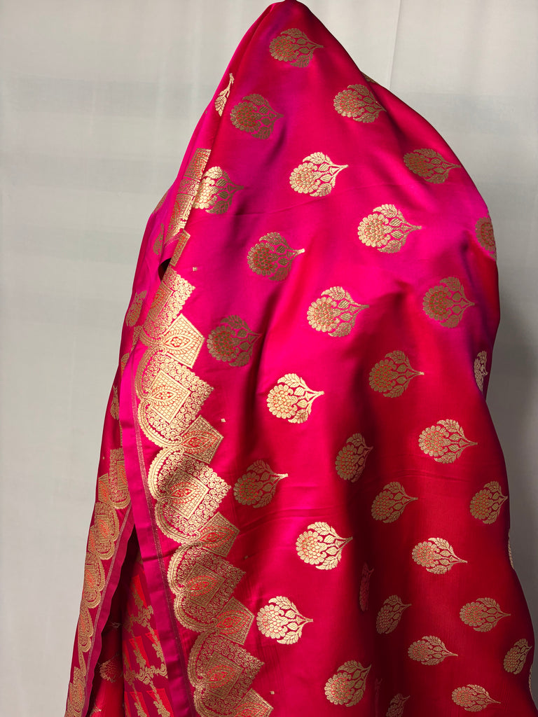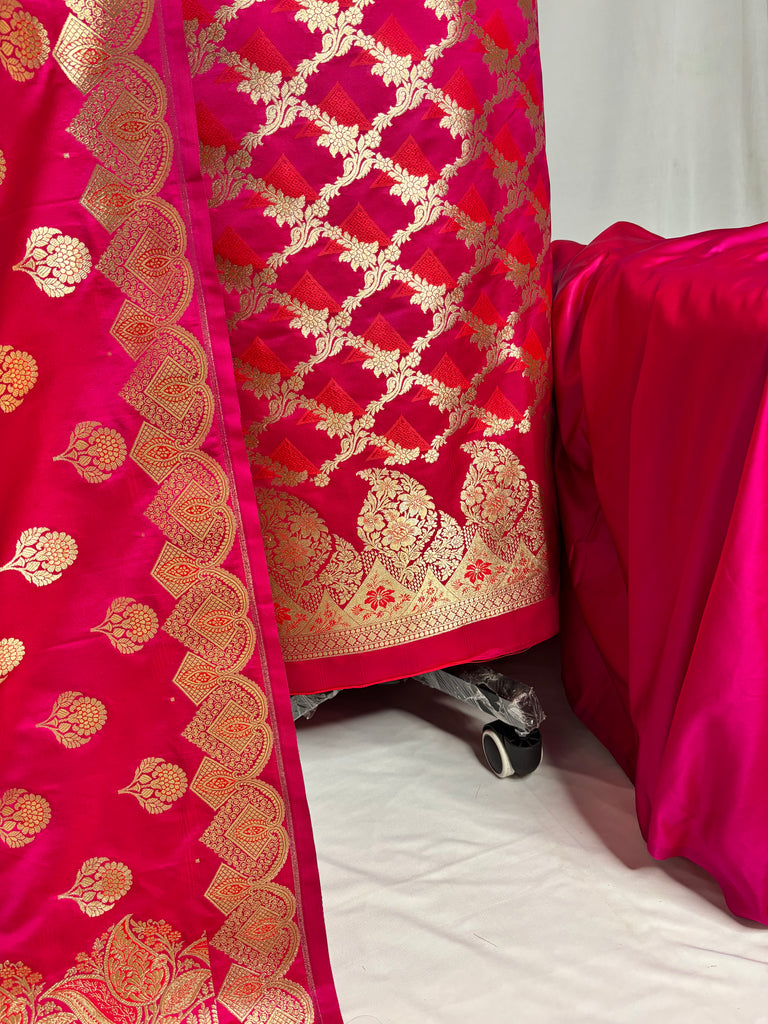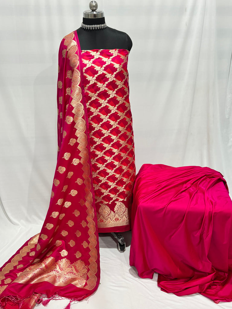 The Kasturi Mashru Three-Piece Suit Set reflects warmth, femininity, and timeless Indian elegance. Crafted in a radiant ruby pink hue, the kurta features a soft Meena woven pattern that enhances the fabric with understated richness.