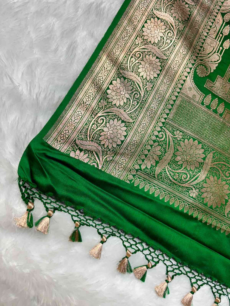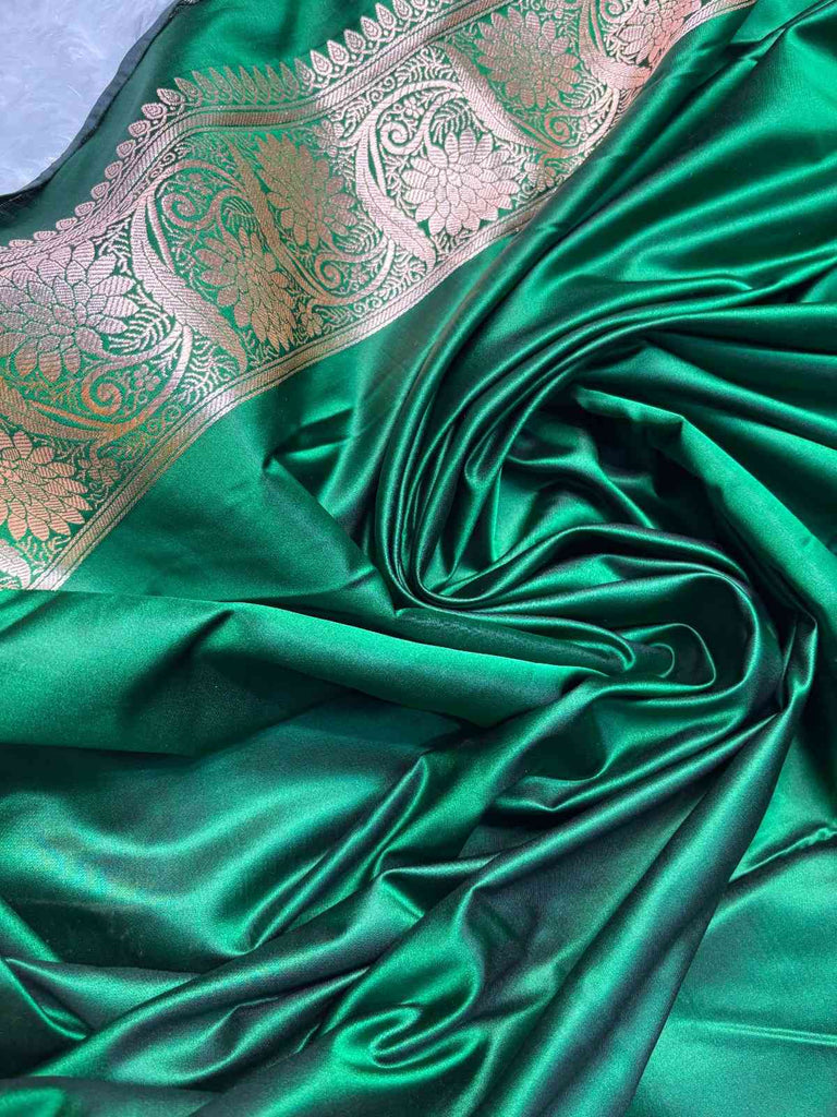 The Rubaab Emerald Satin Saree reflects royal elegance and timeless craftsmanship. Crafted from lustrous satin fabric, the saree showcases a deep emerald green tone that radiates sophistication and festive charm.