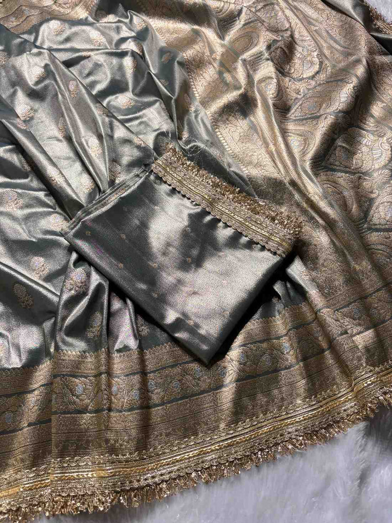 The Sahar-e-Silver Tissue Silk Saree with Fancy Lace is an ode to understated luxury. Woven in a soft light grey tissue silk, this saree reflects a moonlit glow with every drape. The delicate zari motifs lend a traditional charm, while the fancy lace border adds a contemporary couture finish.